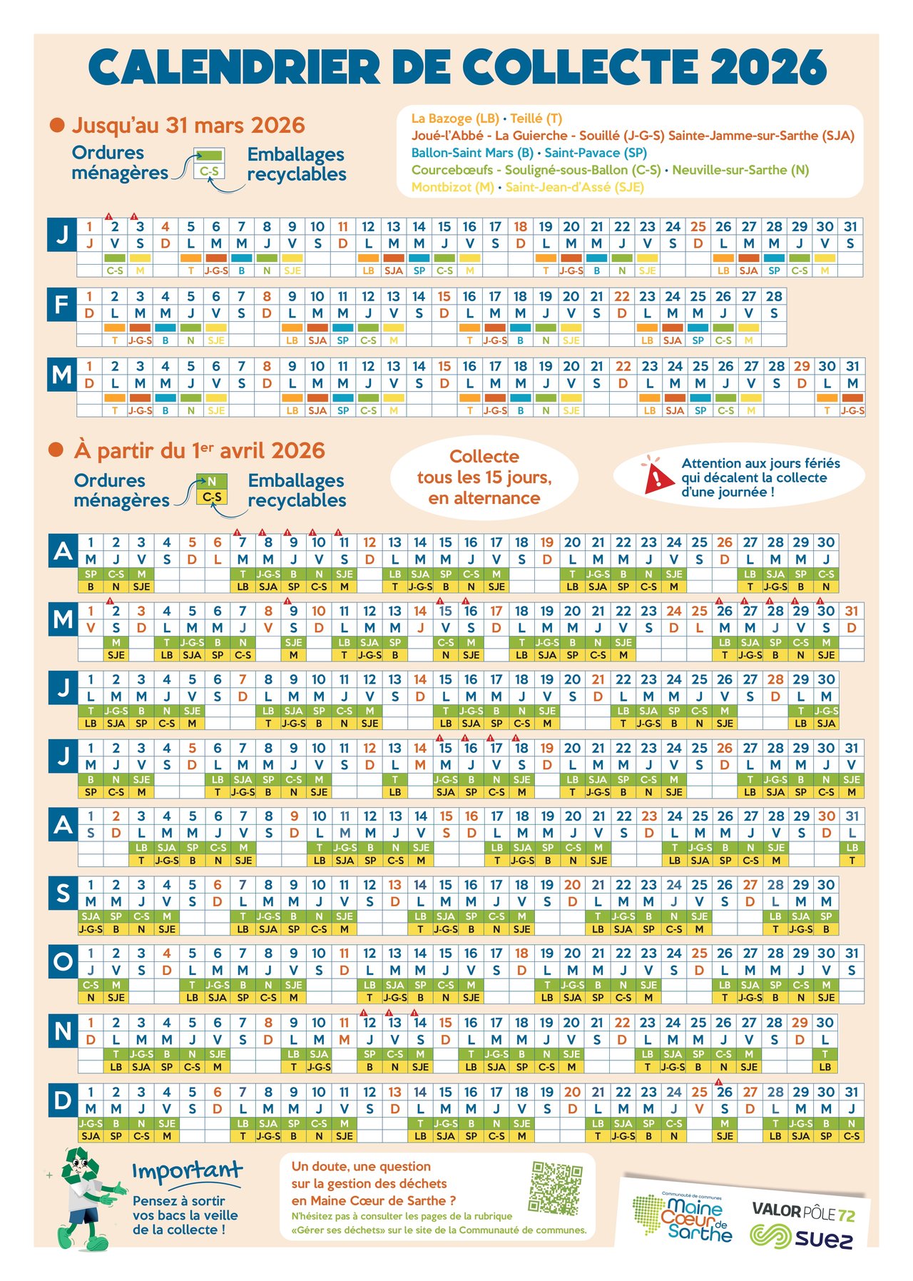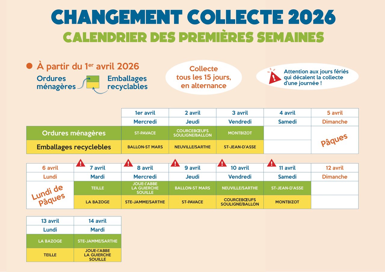 Nous vous rappelons que la nouvelle formule de collecte des déchets débutera le mercredi 1ᵉʳ avril dans l’ensemble des communes Maine Cœur de Sarthe.